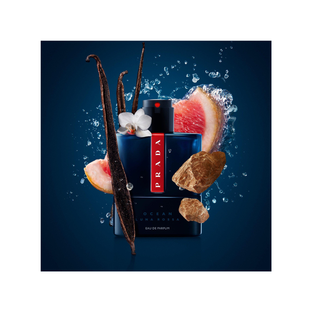 Prada Luna Rossa OCEAN Eau de Parfum, το νέο ανδρικό άρωμα, για τον μοντέρνο εξερευνητή. Βασισμένο στην πεποίθηση ότι με την τεχνολογία ως προέκταση του εαυτού μας, μπορούμε να ξεπεράσουμε τα όριά μας, να ξαναφανταστούμε τι είναι δυνατό και να αυξήσουμε τις επιδόσεις μας. Το Luna Rossa OCEAN Eau de Parfum συνδυάζει έντονη κομψότητα και αισθησιασμό μέσα από την πρωτοποριακή τεχνολογία και τα καλύτερα συστατικά της φύσης. Λακαρισμένο σε ένα εκλεπτυσμένο βαθύ μπλε, που παραπέμπει στη ένταση του βάθους των ωκεανών. Χαρακτηρίζεται από την εμβληματική κόκκινη γραμμή PRADA, σύμβολο καινοτομίας. Ένα κομψό, γυαλιστερό μαύρο πώμα με μία συμβολική κόκκινη κουκκίδα για αντίθεση, που παραπέμπει στο κόκκινο φεγγάρι.