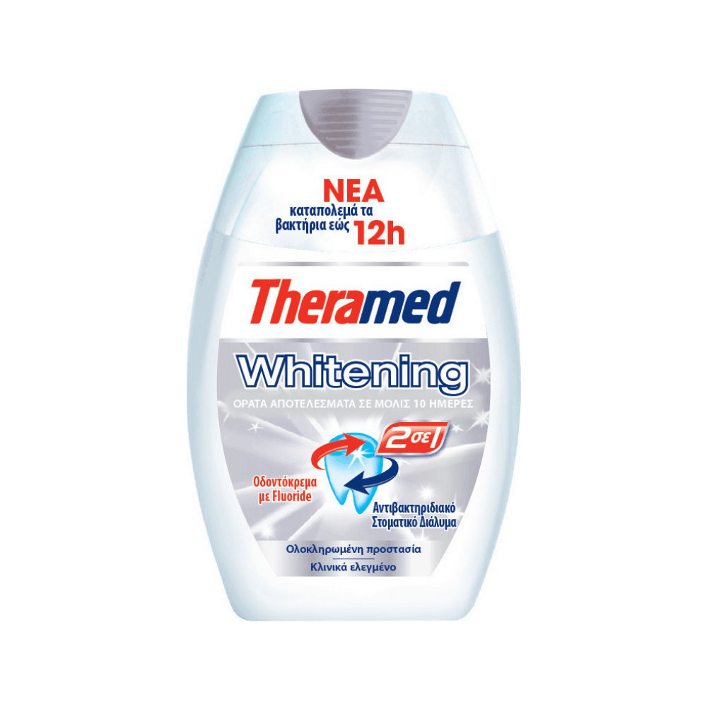 Το Theramed Whitening συνδυάζει οδοντόκρεμα και στοματικό διάλυμα μαζί. Για καθαρά και ηγιή δόντια χωρίς λεκέδες.