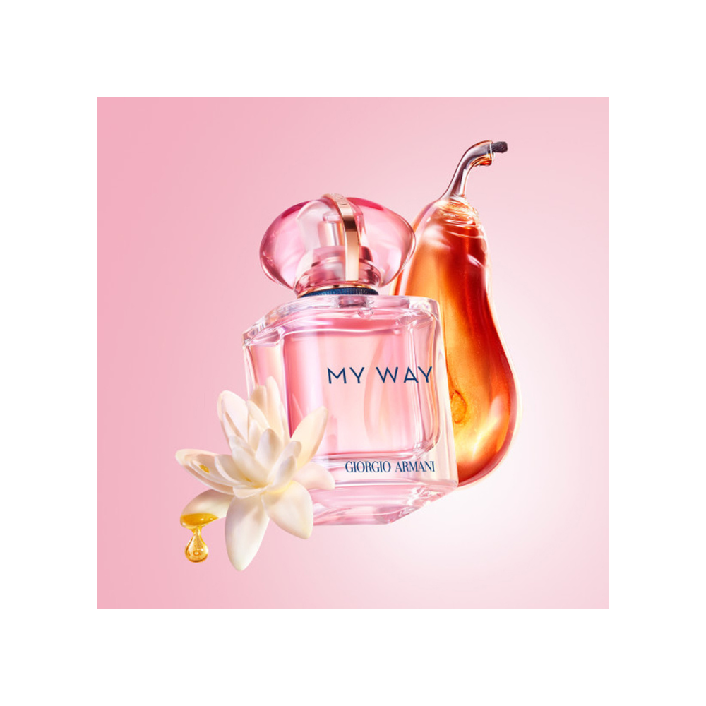 Το My Way Eau de Parfum Nectar σας προσκαλεί σε ένα μαγευτικό ταξίδι, αποκαλύπτει μια γλυκιά, φρουτώδη και ζουμερή παραλλαγή του εμβληματικού MY WAY, συνδυάζοντας τη χαρακτηριστική κρεμώδη τουμπερόζα με τις απολαυστικά δροσερές, φρουτώδεις νότες μιας συμφωνίας ζουμερού αχλαδιού. Περικλείεται σε ένα νέο, ημιδιάφανο ροζ φυλαχτό που λειτουργεί σαν πώμα, αντανακλώντας τον φωτεινό, δροσερό και πλούσιο χυμό του My Way Eau de Parfum Nectar I AM WHAT I LIVE.