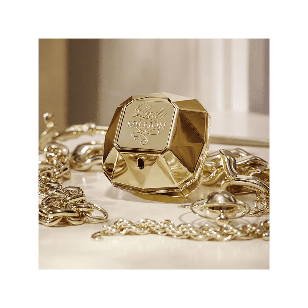 Εξαιρετικά θηλυκό και τολμηρό, το Lady Million, αποτελεί μια αισθησιακή πρόσκληση σε ένα ταξίδι γοητείας και λάμψης! Φρέσκο, ξύλινο-floral, περιέχει κορυφαίες σημειώσεις που καλύπτουν floral νέκταρ, λεμόνι και σμέουρο και συνδυάζονται βαθμιαία σε μια καρδιά ανθού πορτοκαλιάς, neroli και sambac jasmine. Οι πλούσιες ξύλινες σημειώσεις βάσης διανθίζονται με patchouli, gardenia και μέλι και προσθέτουν μια αισθησιακή αφή σε αυτό το δονούμενο άρωμα. Ακριβώς όπως μια ανεξάρτητη, σαγηνευτική γυναίκα, το Lady Million προσφέρει πολλές αποχρώσεις. Η floral συμφωνία αποτελεί το βασιλοπρεπές σημείο εστίασης της σύνθεσης. Η πολύπλευρη σύνθεση προσφέρει τις κάμψεις του αλμυρού δαμάσκηνου, του woodsy πυρήνα, του fruity βερίκοκου και του μεθυστικού συνδυασμού neroli και jasmine. Κάθε ψεκασμός εκφράζει τον πλούτο έμπνευσης πίσω από τα διαφανή κύματα των γλυκών φρούτων και των πυρακτωμένων florals. Ο Paco Rabanne σχεδίασε αυτήν την νέα έκδοση δίνοντας τη μορφή ενός χρυσού διαμαντιού για να αποδώσει τη λαμπερή, ανεξάρτητη, femme fatale φύση της σύγχρονης γυναίκας. Ένα άρωμα συνώνυμο με την επιθυμία και το πάθος! Απολαμβάνοντας τη ζωή στον πληρέστερο, η γυναίκα Million αποκρίνεται στην υπερβολή με μια απίστευτη γοητεία που μοιάζει εξωπραγματική!