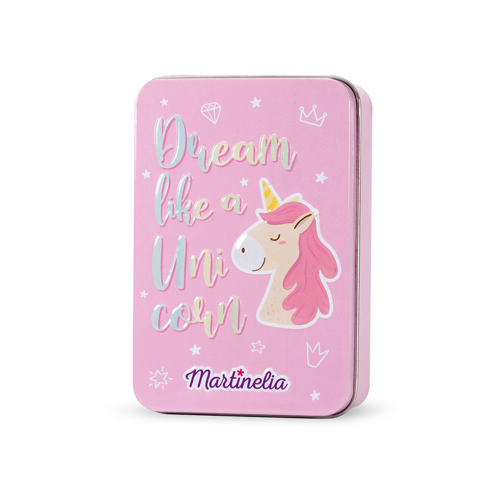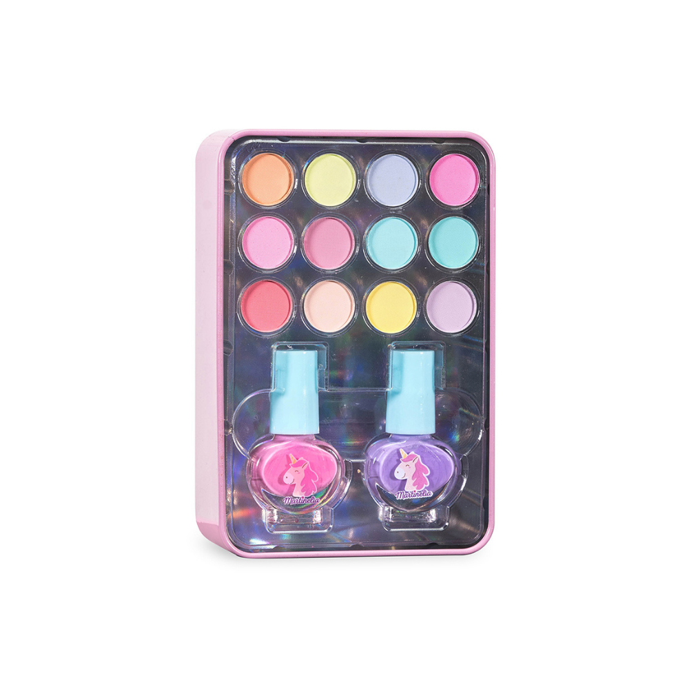 To Martinelia Little Unicorn Mini Beauty Kit είναι ένα παιδικό σετ που περιλαμβάνει 2 υδατοδιαλυτά βερνίκια νυχιών σε ροζ και μωβ χρώμα και 12 σκιές ματιών σε ένα μεταλλικό κουτάκι αποθήκευσης. Είναι δερματολογικά ελεγμένα.