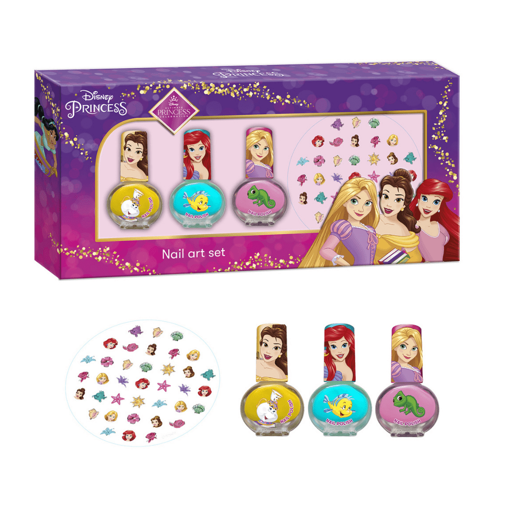 Παιδικό σετ μανικιουρ Disney Princess που περιλαμβάνει 3 υδατοδιαλυτά βερνίκια νυχιών σε ροζ, κίτρινο και γαλάζιο χρώμα και μια καρτέλα στίκερ νυχιών σε σχέδια Disney Princess. Είναι δερματολογικά ελεγμένα.