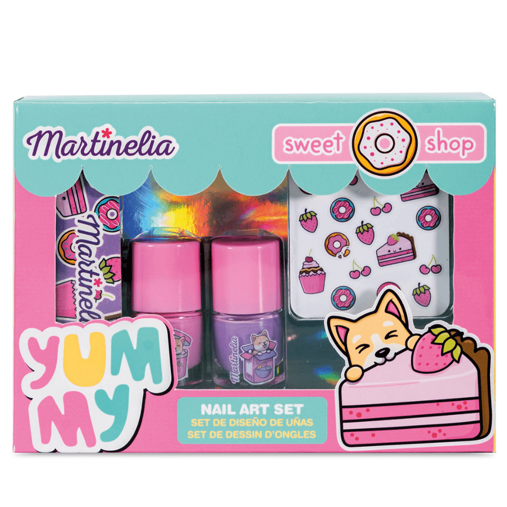 Παιδικό σετ μανικιουρ Yummy που περιέχει 2 υδατοδιαλυτά βερνίκια νυχιών σε ροζ και μωβ χρώμα, 1 λίμα και αυτοκόλλητα νυχιών σε διάφορα σχέδια. Είναι δερματολογικά ελεγμένο.