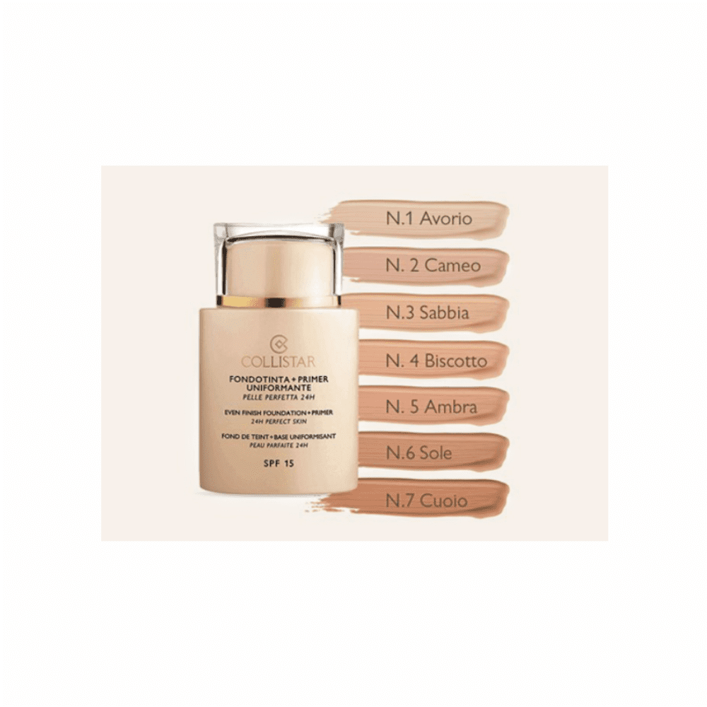 Το Collistar Even Finish Foundation + Primer 24Η perfect skin είναι ένας συνδυασμός make-up foundation και ενός primer σε ένα προϊόν! Για τέλειο δέρμα και make-up που διατηρείται άψογο επί 24 ώρες χωρίς να χρειάζεται ανανέωση. Περιέχει το αποκλειστικό Hydro-Uniforming Complex® το οποίο ενυδατώνει την επιδερμίδα ενώ παράλληλα χαρίζει διαύγεια και εξισορροπεί τον δερματικό τόνο. Οι νέας γενιάς χρωστικές εγγυώνται σταθερότητα και φωτεινή όψη σε όλους τους τύπους φωτός (φυσικό και τεχνητό).