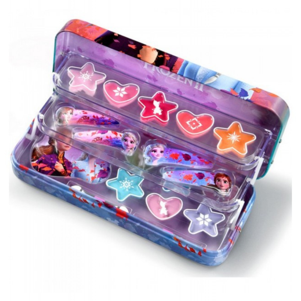 Παιδική multi παλέτα προσώπου Frozen σε μεταλλική κασετίνα που περιλαμβάνει 5 pot lip gloss, 6 σκιές ματιών, 2 πινελάκια και 4 κοκαλάκια μαλλιών.