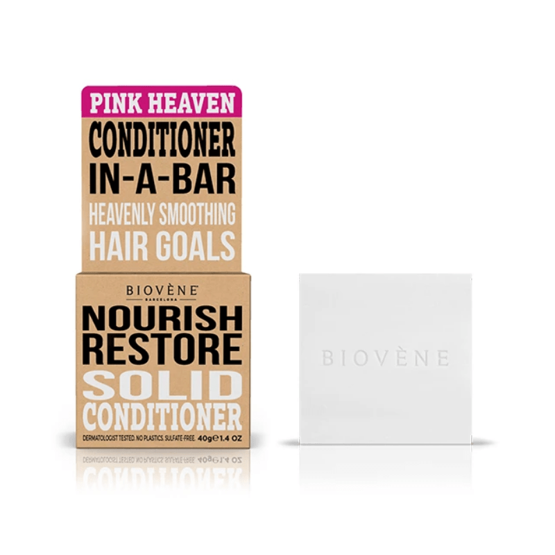 Το Nourish Restore Pink Heaven Solid Conditioner είναι μπάρα conditioner, εμπλουτισμένη με φυσικό κερί μέλισσας, βούτυρο καριτέ, μεταλλικά στοιχεία, βανίλια και αιθέρια έλαια λεβάντας και γκρέιπφρουτ. Αποκτήστε την εμπειρία για πυκνότερα, και υγιή μαλλιά, με βιοτίνη και το καλύτερο μείγμα της φύσης. Αναδομεί και θρέφει κάθε τρίχα ενώ περιποιείται τα μαλλιά σε βάθος, προκειμένου να γίνουν ακαταμάχητα απαλά, λεία και λαμπερά.