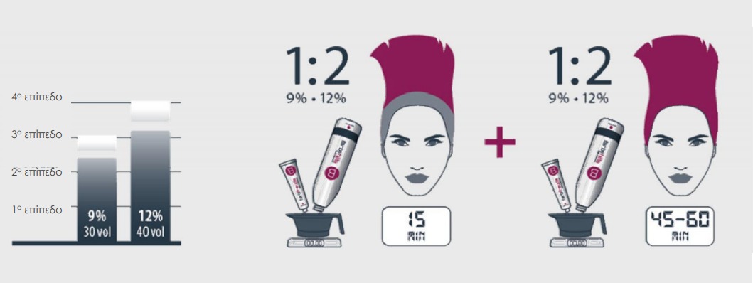 Εφαρμόστε την κρέμα βαφής πρώτα στην ανθεκτική περιοχή των μαλλιών και μετά στην πιο ευαίσθητη. Χρόνος διαδικασίας: 20 -25 λεπτά (χωρίς θερμότητα) Για χρωματική ισορροπία εφαρμόστε τη νέα σύνθεση (ημι-μόνιμη) με χαμηλότερη συγκέντρωση σε υπεροξείδιο, σε μεσαίο μήκος και σε μακρύ μήκος μαλλιών. Χρόνος διαδικασίας: 10-15 λεπτά (χωρίς θερμότητα) Ελέγξτε το χρωματικό αποτέλεσμα πριν ξεπλύνετε τη βαφή.