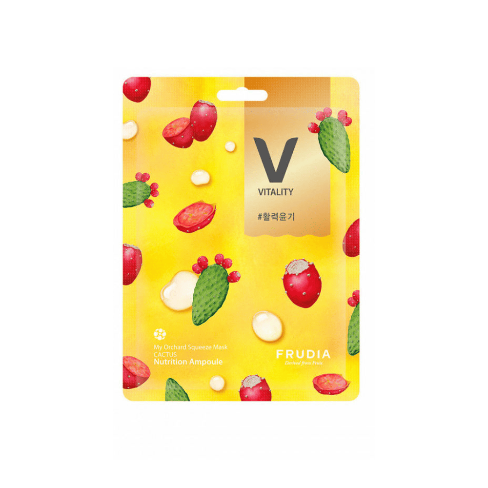 Μάσκα προσώπου της Frudia, η οποία είναι φτιαγμένη από λεπτό ύφασμα ή χαρτί σε σχήμα προσώπου και είναι εμποτισμένη με ευεργετικά για την επιδερμίδα συστατικά. Μπορεί να χρησιμοποιηθεί μόνο μια φορά και πρέπει να εφαρμόζεται στο δέρμα ταμποναριστά μέχρι να σταθεροποιηθεί καλά. Χάρη στη σύνθεσή της με αυξημένη περιεκτικότητα σε συστατικά, εισχωρεί στις ανώτερες στοιβάδες του δέρματος ενυδατώνοντας και αποκαθιστώντας τη χαμένη φωτεινότητα.