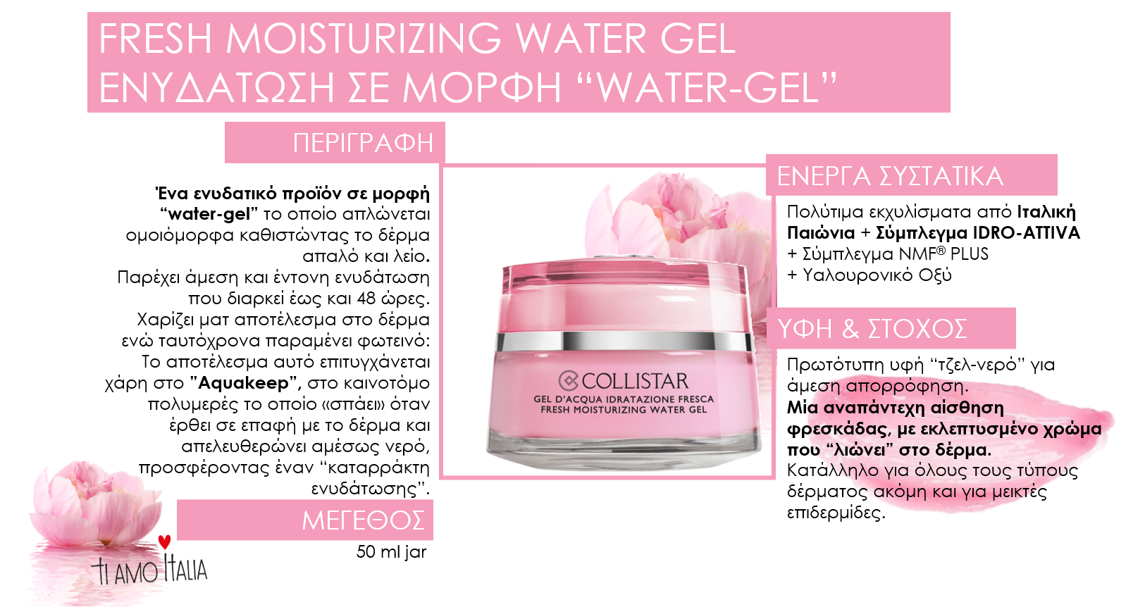 Η Collistar Idro-Attiva Fresh Moisturizing Gelee Cream είναι ένα ενυδατικό προϊόν σε μορφή water-gel το οποίο απλώνεται ομοιόμορφα καθιστώντας το δέρμα απαλό και λείο, με ματ αποτέλεσμα ενώ παραμένει φωτεινό. Παρέχει άμεση και έντονη ενυδάτωση που διαρκεί έως και 48 ώρες.
