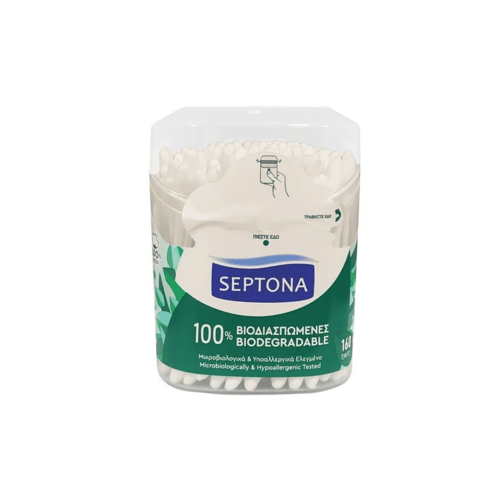 Οι βιοδιασπώμενες μπατονέτες SEPTONA, χάρη στις άκρες τους από 100% βαμβάκι, καθαρίζουν απαλά και προσφέρουν φυσική φροντίδα σε όλη την οικογένεια.