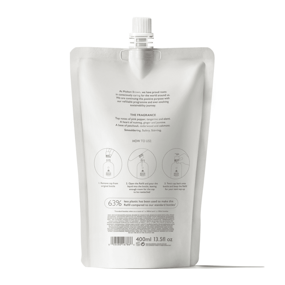 Αφρόλουτρο από τον οίκο Molton Brown που καθαρίζει την επιδερμίδα και την αφήνει ελαφρώς αρωματισμένη. Συνδυάζει νότες κορυφής από ροζ πιπέρι, έλιμι και μανταρίνι με μεσαίες νότες από μοσχοκάρυδο, τζίντζερ και γιασεμί φύλλα βιολέτας και νότες βάσης από πατσουλί, κέδρο και βελανιδιά.
