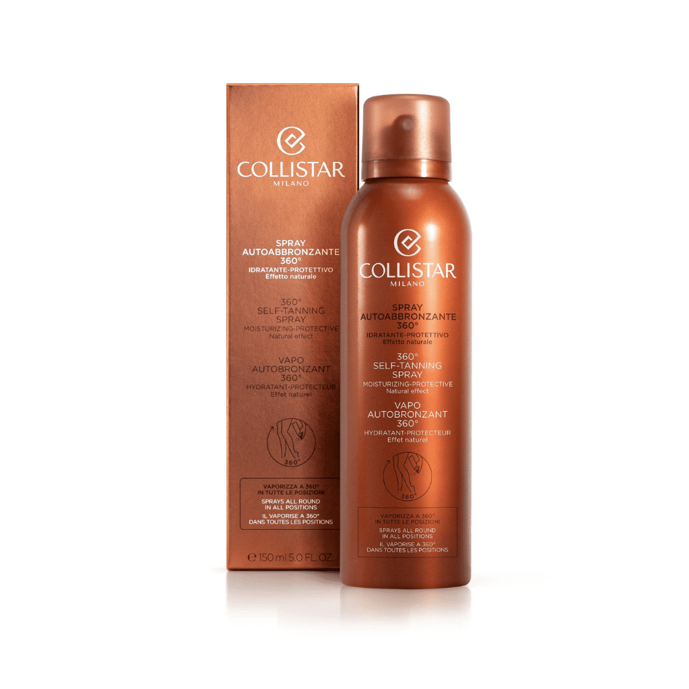 Το Collistar 360° Self-Tanning Spray είναι αυτομαυριστικό spray σώματος ταχείας δράσης που προσφέρει ενυδάτωση και προστασία ενώ ταυτόχρονα χαρίζει τέλειο χρώμα φυσικού μαυρίσματος σε όλο το σώμα. Η αντλία στοχεύει προς όλες τις κατευθύνσεις και επιτρέπει στο προϊόν να εφαρμόζεται ομοιόμορφα ακόμη και στα πιο δυσπρόσιτα σημεία του σώματος. Περιέχει βιταμίνη Ε, ενυδατώνει και προστατεύει το δέρμα. Χάρη στην εξαιρετικά ελαφριά υφή, στεγνώνει αμέσως και είναι ιδανικό για να δώσει χρώμα στα γυμνά πόδια.