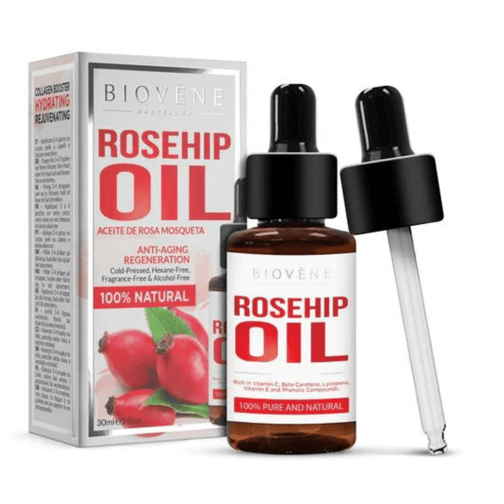 Το Biovène Rosehip Oil είναι γνωστό από την αρχαιότητα για τα πολλαπλά οφέλη του. Περιέχει συνδυασμό από Προβιταμίνη A, Βιταμίνη E, Βιταμίνη C, Ωμέγα 3, 6, 9 και λιπαρά οξέα τα οποία βοηθούν στην ενθάρρυνση της παραγωγής κολλαγόνου, στην αποκατάσταση της λάμψης, στη διατήρηση της απαλότητας & της ενυδάτωσης.