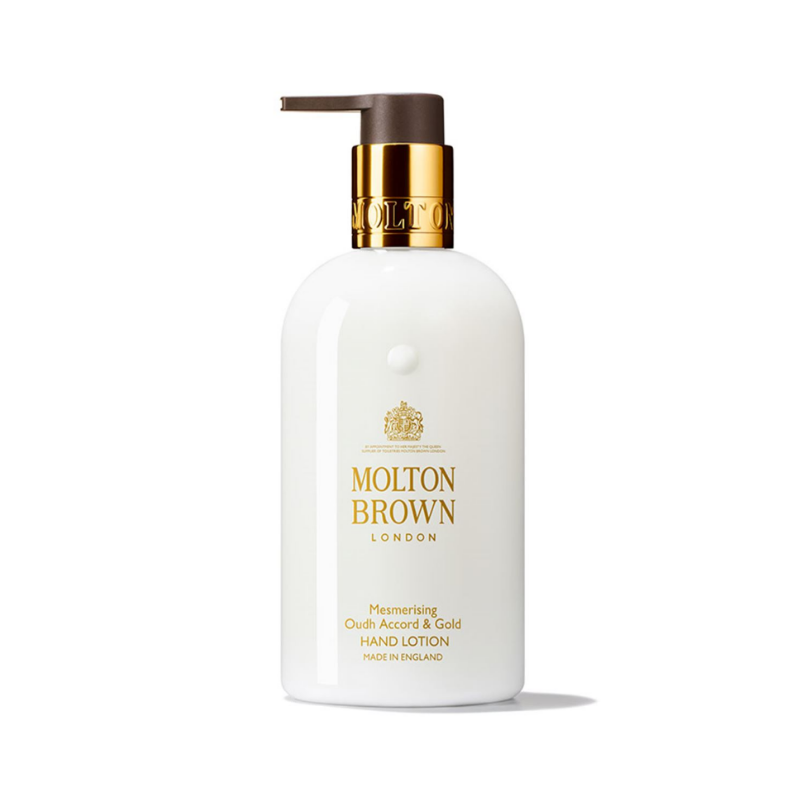 Mesmerising Oudh Accord & Gold λοσιόν χεριών από τον οίκο Molton Brown που συνδυάζει νότες κορυφής από φύλλα κανέλλας, μοσχοκάρυδο και περγαμόντο με μεσαίες νότες από elemi, μύρρο και μάυρο τσάϊ. Οι νότες βάσης αποτελούνται από oudh, βέτιβερ και μέλι.