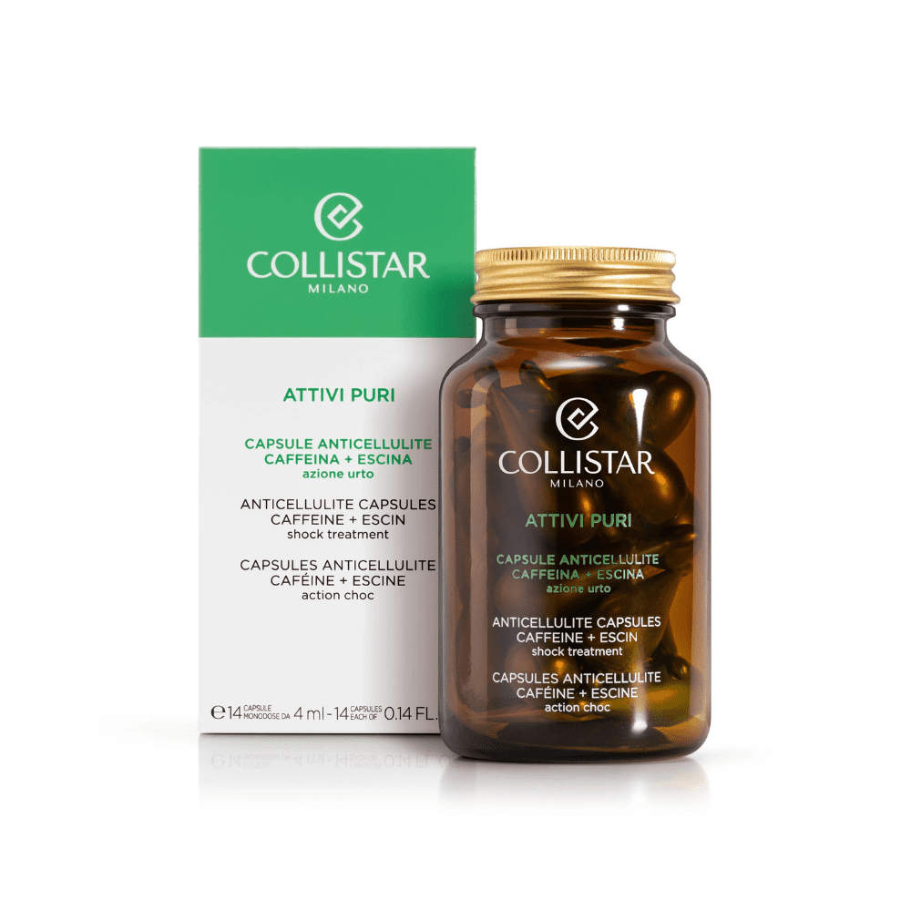 H Collistar Anticellulite Capsules Caffeine + Escin είναι μια πρωτοποριακή θεραπεία κατά των ατελειών που οφείλονται στην κυτταρίτιδα. Η πρωτοποριακή αυτή η θεραπεία συνδυάζει τα δύο πιο αποτελεσματικά δραστικά συστατικά για την καταπολέμηση της κυτταρίτιδας : την καφεΐνη (ένα βασικό λιποδιαλυτικό παράγοντα) και την εσκίνη (φυτικό εκχύλισμα με αποστραγγιστικές ιδιότητες).